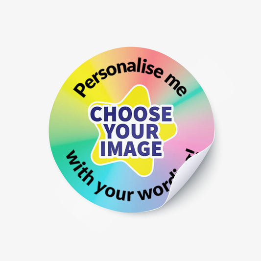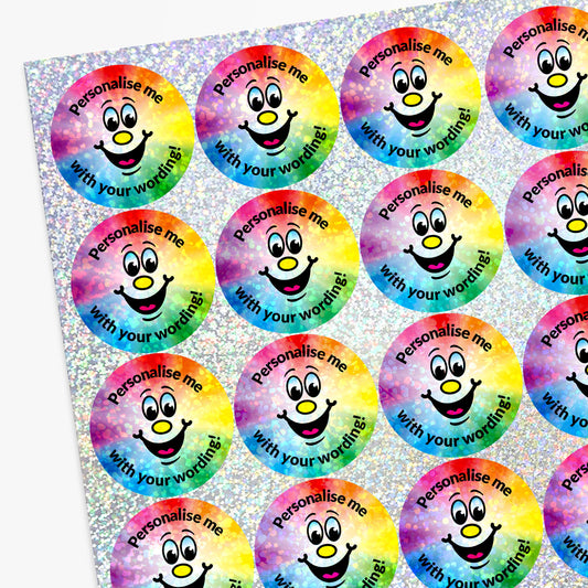35 Personalised Holographic Rainbow Smiley Stickers - 37mm