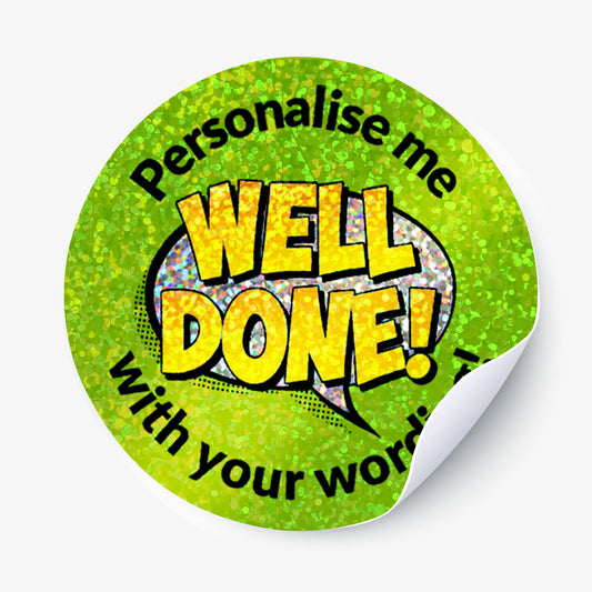 35 Personalised Holographic Well Done Speech Bubble Stickers - 37mm