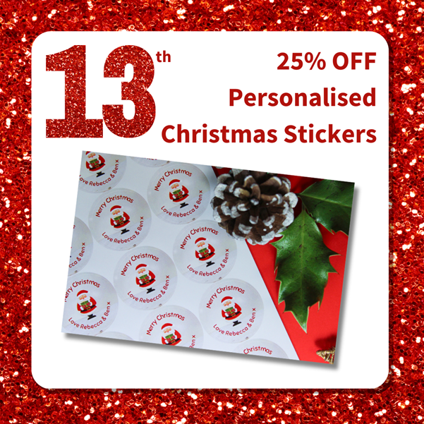 Claim 25% off personalised Christmas stickers, perfect for creating unique gift labels!