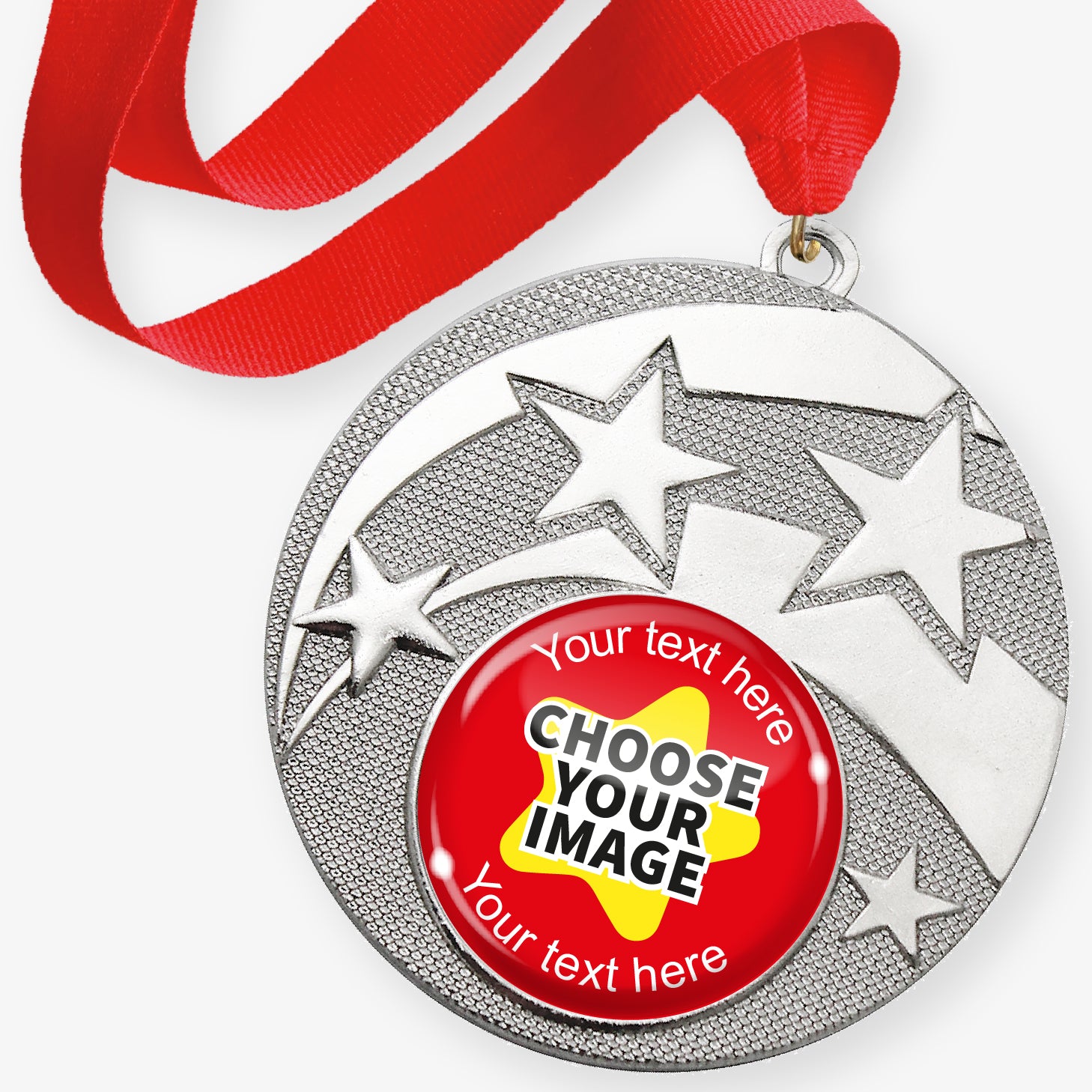 Our fantastic Silver Star Medals give a classy feel with their metal construction and quality ribbon. Personalised with a shiny domed centre.
