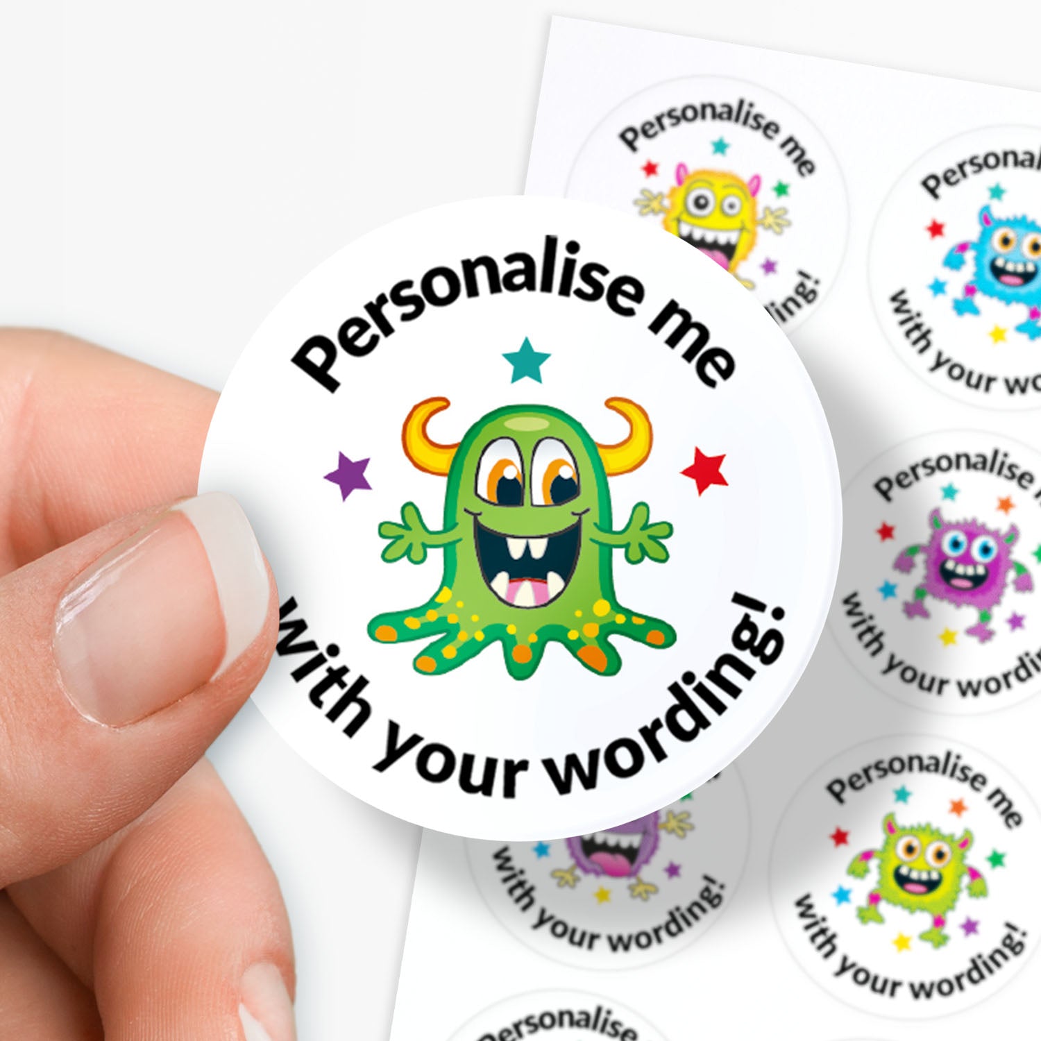 These bubblegum scented monster stickers can be customised with your own wording to create unique pupil rewards.
